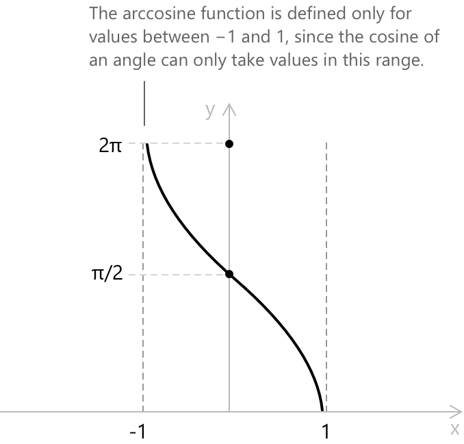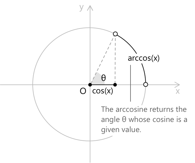 Арккосинус — це обернена до функції косинус. Для заданого числа \(x \in [-1, 1]\) (тобто області значень, які може набувати функція косинус), \(\arccos(x)\) визначається як кут \(\theta\) на проміжку \([0, \pi]\), косинус якого дорівнює \(x\). Як і в випадку з арксинусом, обмеження області значень проміжком \([0, \pi]\) є необхідним для того, щоб обернена функція була однозначно визначеною, оскільки функція косинус не є ін'єктивною на всій своїй області визначення. Відповідна тотожність: