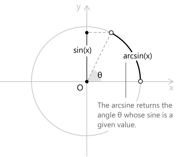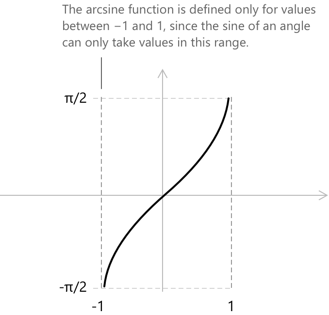 Арксинус — це обернена до функції синус. Для заданого числа \(x \in [-1, 1]\) (тобто області значень, які може набувати функція синус), \(\arcsin(x)\) визначається як кут \(\theta\) на проміжку \([-\pi/2, \pi/2]\), синус якого дорівнює \(x\). Загалом, обернена функція скасовує дію вихідної: якщо функція \(f\) відображає значення \(x\) у значення \(y\), то її обернена \(f^{-1}\) відображає \(y\) назад у \(x\). Функція синус приймає кут і повертає дійсне число з проміжку \([-1, 1]\), а арксинус робить протилежне, повертаючи кут, синус якого дорівнює заданому значенню. Цей обернений зв'язок виражається тотожністю: