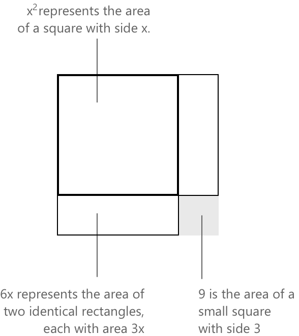 Це геометричне обґрунтування застосовне саме тоді, коли стала частина дорівнює квадрату половини лінійного коефіцієнта, як у полінома з кратним коренем. Прирівнювання виразу до нуля дає рівняння \( (x+3)^2 = 0 \), єдиним розв'язанням якого є \( x = -3 \). У загальному випадку виділення повного квадрата забезпечує необхідну алгебраїчну корекцію, навіть якщо підсумкова конфігурація не відповідає конкретній геометричній реалізації над додатними дійсними числами.