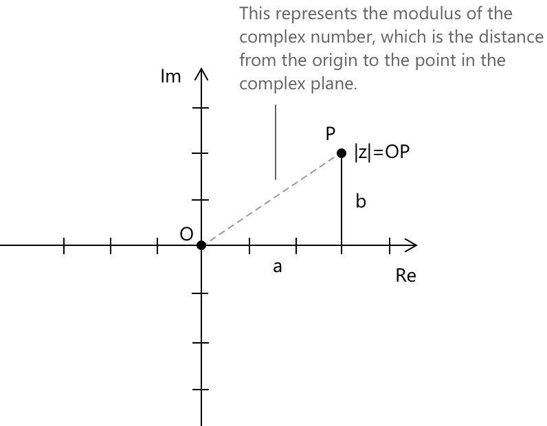 Він представляє відстань від початку координат до точки \( (a, b) \) на комплексній площині. Це означення безпосередньо випливає з теореми Піфагора, оскільки модуль відповідає гіпотенузі прямокутного трикутника з катетами довжиною \( |a| \) та \( |b| \):