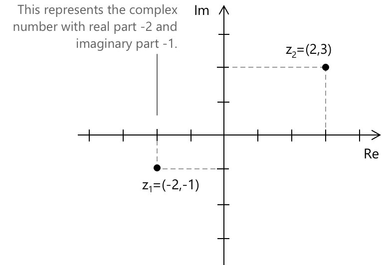 Можна також зауважити, що як векторний простір над \( \mathbb{R} \), поле \( \mathbb{C} \) має розмірність два з базисом \( {1, i} \). Саме ця двовимірність робить геометричну інтерпретацію на комплексній площині такою природною: дійсна та уявна частини комплексного числа слугують координатами відносно цього базису.