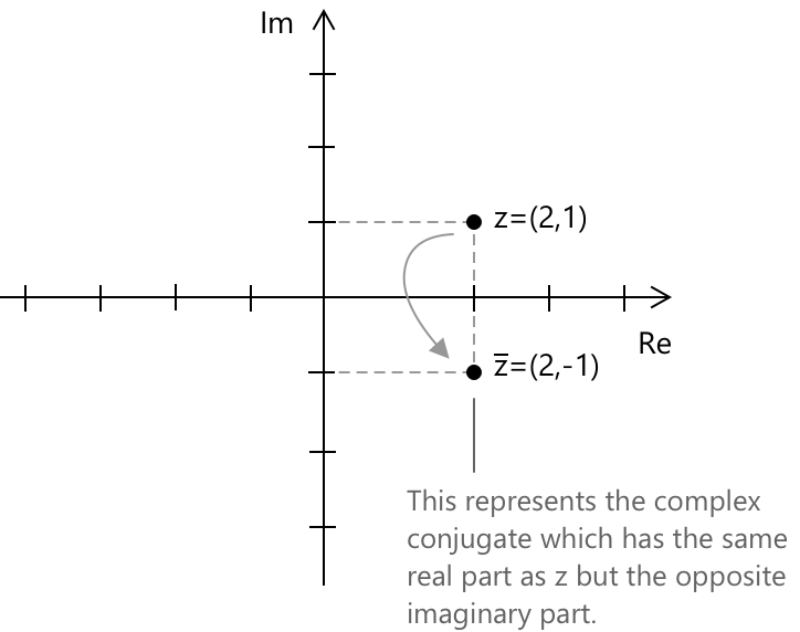 \( \overline{z} \) представляється на комплексній площині точкою, симетричною відносно \( z \) щодо осі \( x \).