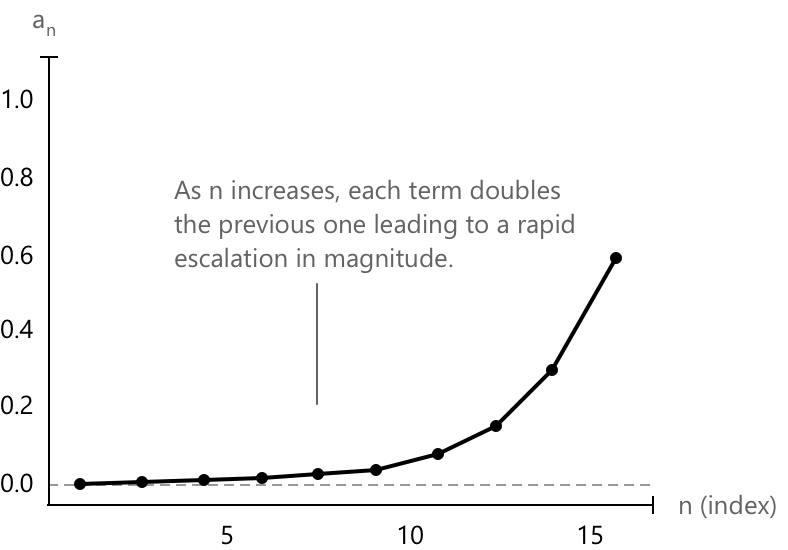 Як показано на графіку, при \( q = 2 \) значення геометричної послідовності \( a_n = q^n \) зростають експоненціально. Зі збільшенням \( n \) кожен член подвоює попередній, що призводить до швидкого зростання величини.