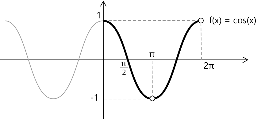 - Точки максимуму та мінімуму: \( \cos(x) \) досягає свого максимуму \(1\) при \( x = 2k \pi \) з \( k \in \mathbb{Z} \) та свого мінімуму \(-1\) при \( x = \pi + 2k \pi \) з \( k \in \mathbb{Z} \).