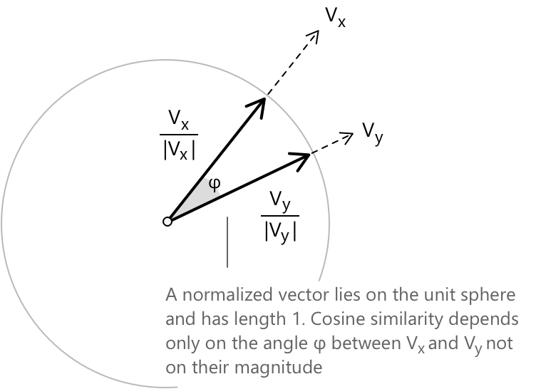 У цих виразах \(V_x \cdot V_y\) позначає скалярний добуток двох векторів, тоді як \(\|V_x\|\) та \(\|V_y\|\) — їхні відповідні евклідові норми. Ділення на добуток норм є саме тим кроком нормалізації, який усуває вплив величини вектора і зберігає лише інформацію про напрямок.