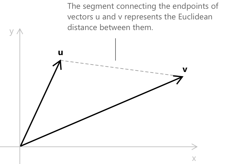 Перед введенням косинусної схожості варто розглянути більш елементарний підхід до вимірювання того, наскільки два вектори близькі один до одного, а саме — евклідову відстань. Дано два вектори \(\mathbf{u} = (u_1, u_2, \ldots, u_n)\) та \(\mathbf{v} = (v_1, v_2, \ldots, v_n)\), евклідова відстань між ними визначається наступним чином: