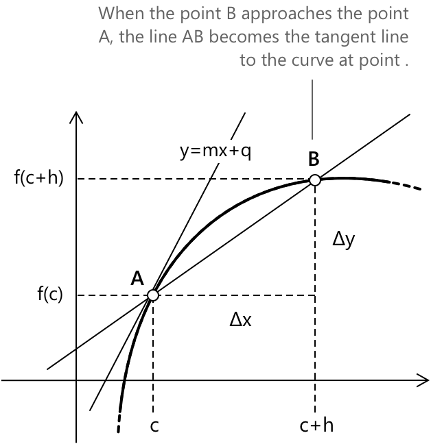 Коли \( h \to 0 \), точка \( B \) наближається до точки \( A \), і пряма \( AB \) стає дотичною до кривої в точці \( A \). Кутовий коефіцієнт дотичної в точці \( A \) називається похідною функції в точці \( c \).