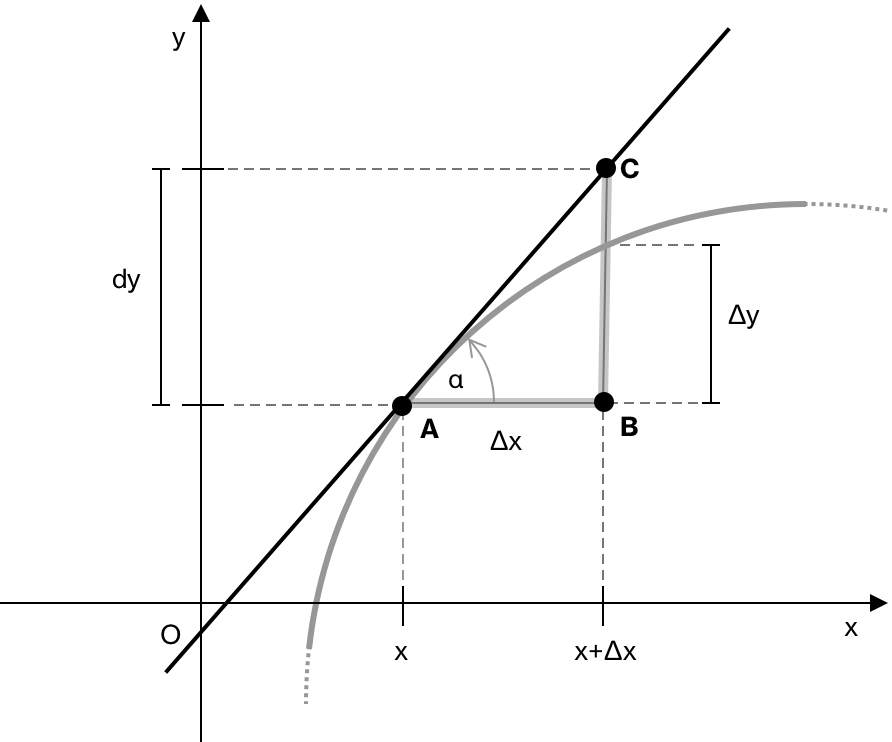 \[ \begin{align} \overline{BC} &= \overline{AB} \cdot \tan(\alpha) \tag{5} \\[0.5em] &= \Delta x \cdot f’(x) \\[0.5em] &= \mathrm{d}y \end{align} \]