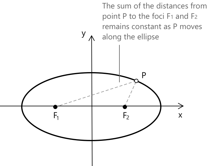 Кожен квадратний корінь представляє евклідову відстань між \( P(x, y) \) та одним із двох фокусів. Це рівняння виражає геометричне означення еліпса: множина всіх точок на площині, таких що сума їхніх відстаней до двох фокусів є сталою. Отже, для визначення рівняння еліпса потрібно просто виконати необхідні обчислення. Маємо: