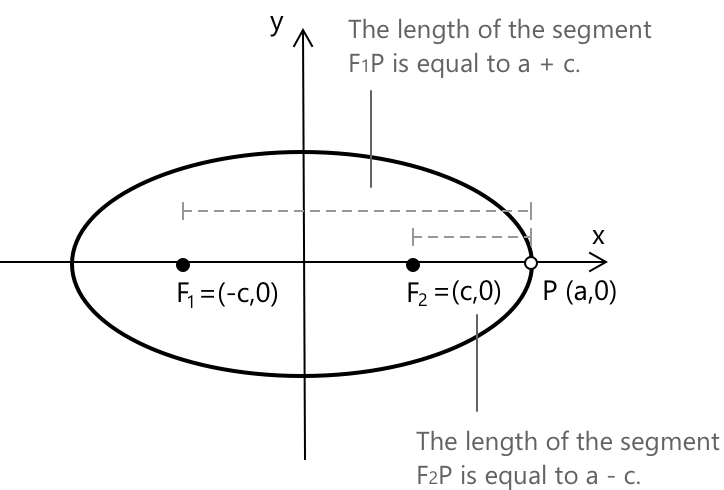 Вибравши точку \( P = (a, 0) \), розташовану в правому кінці великої осі, ми розглянемо випадок, коли еліпс перетинає вісь \( x \) у своїй найвіддаленішій горизонтальній точці. У цій конфігурації відстань від лівого фокуса \( F_1 = (-c, 0) \) до точки \( P \) становить \(\overline{F_1P} = a + c\). Аналогічно, маємо \(\overline{F_2P} = a - c\).
