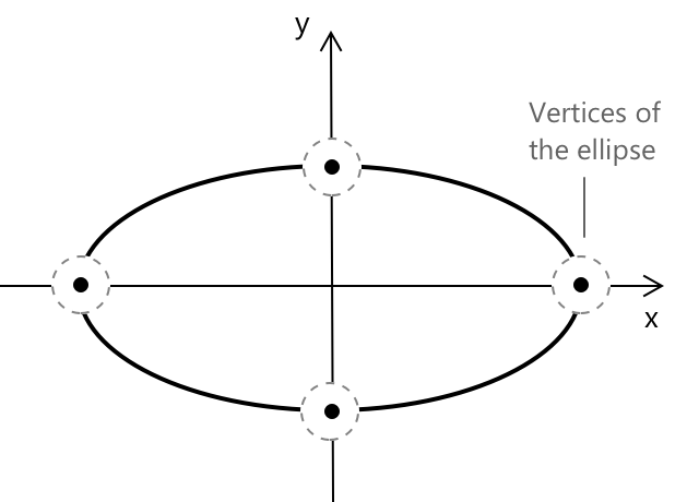 Еліпс перетинає координатні осі в чотирьох ключових точках — своїх вершинах. Дві точки на великій осі представляють найвіддаленіші горизонтальні межі.