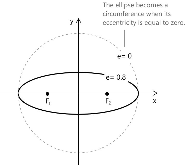 Чим ближче \( e \) до 0, тим більше еліпс нагадує коло. Коли \( e \) наближається до 1, еліпс стає дедалі більш витягнутим. Значення ексцентриситету \( e \) задано формулою: