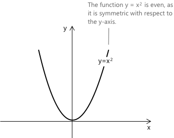 Як показано на рисунку, функція \( f(x) = x^2 \) є параболою, симетричною відносно \(y\)-осі. Загалом, функції вигляду \( f(x) = x^4 \), \( x^6 \), або більш загально \( x^{2n} \), де показник степеня є парним, є прикладами парних функцій.