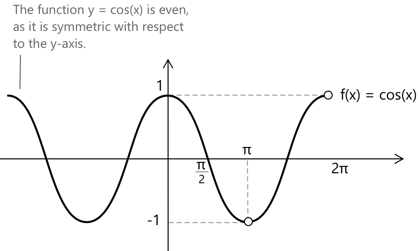 Іншим прикладом парної функції є функція косинуса. Це періодична функція з періодом \( 2\pi \), і її графік симетричний відносно \(y\)-осі. Фактично, легко перевірити, що: \[ \cos(\pi) = \cos(-\pi) = -1 \]