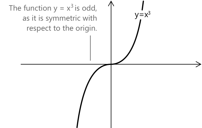 Як показано на рисунку, функція \( f(x) = x^3 \) симетрична відносно початку координат. Функції вигляду \( f(x) = x^3 \), \( x^5 \), або загальніше \( x^{2n+1} \), де показник степеня є непарним, є прикладами непарних функцій.