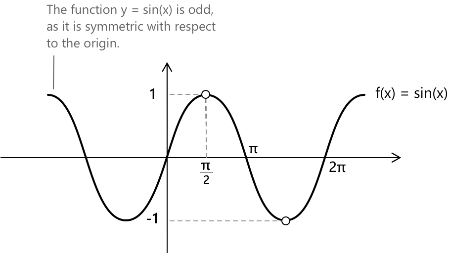 Іншим прикладом непарної функції є функція синус. Вона є періодичною функцією з періодом \( 2\pi \), і її графік симетричний відносно початку координат. Власне, легко перевірити, що: