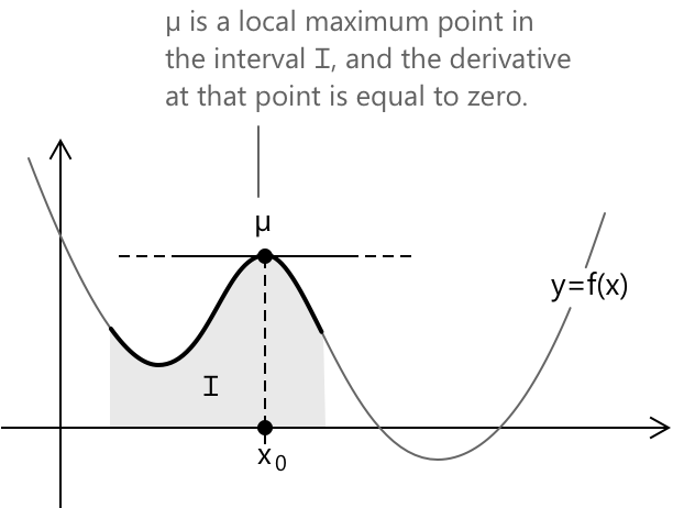 Наступний графік ілюструє теорему. У точці локального максимуму \( \mu \) всередині проміжку \( I \) похідна функції дорівнює нулю.