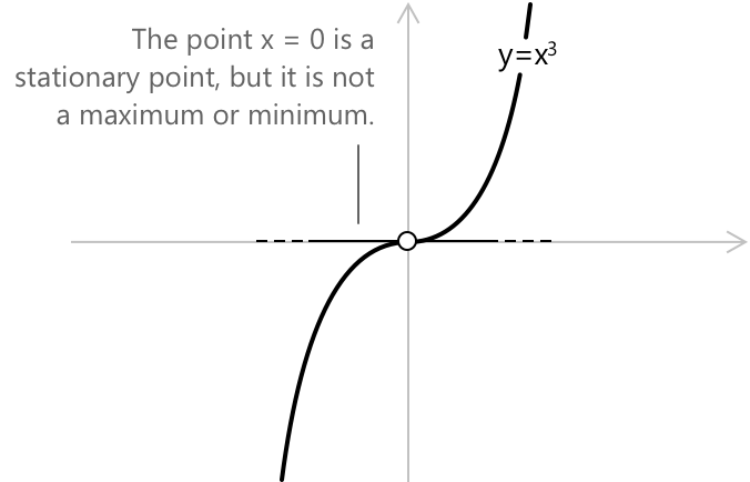 У певних випадках похідна функції стає рівною нулю в точці, яка не є ні максимумом, ні мінімумом. Такі точки називають стаціонарними точками без екстремуму, включаючи стаціонарні точки перегину, де похідна дорівнює нулю, але функція зберігає свій напрямок.