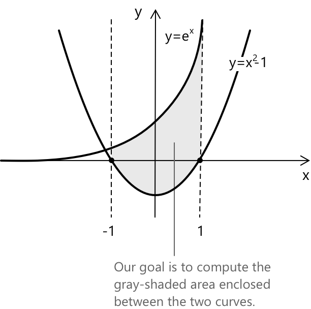 Припустимо, ми хочемо знайти площу, обмежену кривими \(y_1 = e^x\) та \(y_2 = x^2 - 1\) на проміжку \( x \in [-1, 1] \). Графічно ми маємо наступну ситуацію: