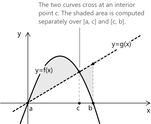 Після того як проміжок відомий, дві криві можуть перетнутися всередині нього, що означає, що \( f(x) \) та \( g(x) \) змінюють своє відносне положення в деякій внутрішній точці \( c \). Коли це стається, підінтегральна функція \( f(x) - g(x) \) змінює знак, і один інтеграл по \( [a, b] \) призведе до того, що площі вище і нижче осі x взаємно знищаться, що дасть неправильний результат.