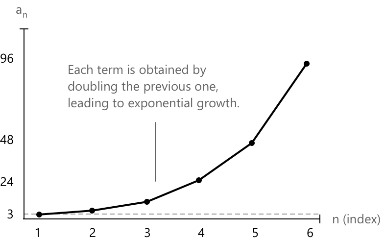 Ця послідовність є геометричною прогресією, що починається з 3, де кожен член отримується множенням попереднього на \( r = 2 \).