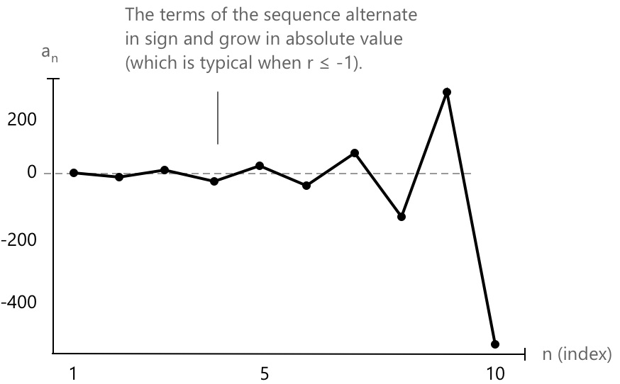 - Якщо \( r < 0 \), прогресія знакозмінна.