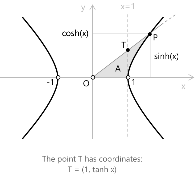 Після того, як точка \(P(\cosh(x), \sinh(x))\) на гіперболі була визначена як така, що відповідає підписаному гіперболічному сектору площею \(x/2\), гіперболічний тангенс і котангенс можна визначити за її координатами. Гіперболічний тангенс — це відношення вертикальної координати до горизонтальної: