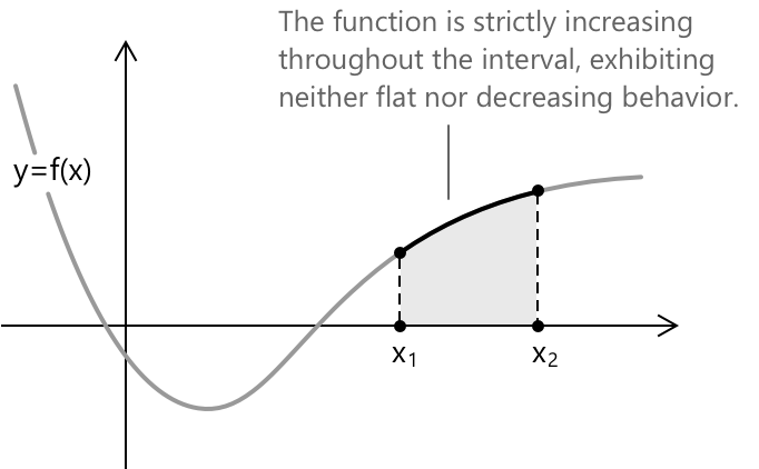 Це означає, що в міру зростання аргументу \( x \) на проміжку \( I \), значення \( f(x) \) також суворо зростає, без будь-яких плоских або спадаючих ділянок.