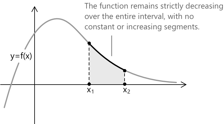 Нехай \( y = f(x) \) — функція, визначена на області визначення \( X \subseteq \mathbb{R} \). Ми кажемо, що \( f \) є суворо спадаючою на проміжку \( I \subseteq X \), якщо для будь-яких двох значень \( x_1, x_2 \in I \), таких що \( x_1 < x_2 \), виконується наступна умова: