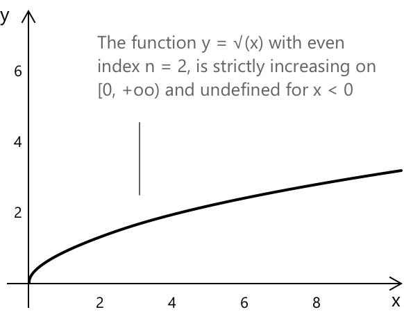 без будь-яких додаткових умов на область визначення, оскільки функція є монотонною на всій \(\mathbb{R}\). Таким чином, випадок з непарним показником є простішим і повторює підхід до розв'язання ірраціональних рівнянь з непарним показником.