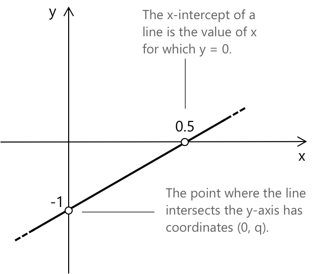 \(m\) — це кутовий коефіцієнт прямої, а \(q\) — точка перетину з віссю y. Точка перетину прямої з віссю x — це значення x, при якому y = 0 (іншими словами, це корінь рівняння прямої).