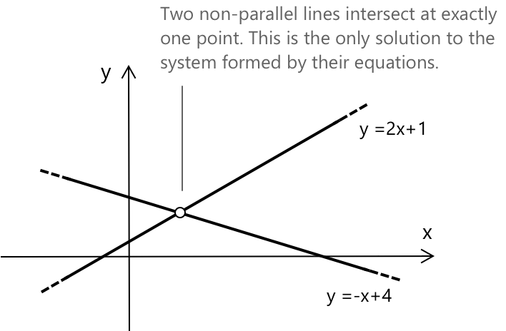 Якщо прямі паралельні, вони ніколи не перетинаються, оскільки мають однаковий кутовий коефіцієнт і ніколи не пересікають одна одну. Дві прямі, що не є паралельними, перетинаються в одній точці. Координати точки перетину є розв'язаннями системи, утвореної рівняннями двох прямих.