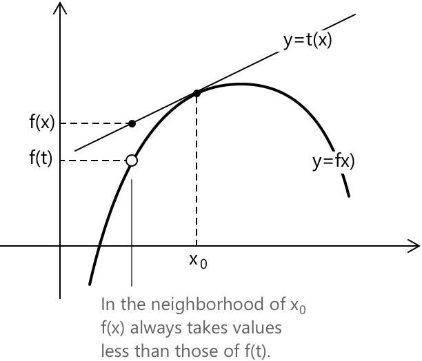 \[ \begin{align} f’(x) &> 0 \quad \text{для} \quad x < x_0 \\ f’(x) &< 0 \quad \text{для} \quad x > x_0 \end{align} \]