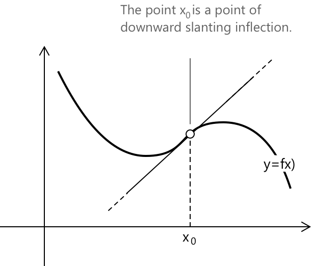 Точка \( x_0 \) є похилою точкою перегину, якщо: \[ f’(x_0) \neq 0, \quad f’'(x_0) = 0 \] і випуклість змінює знак навколо \( x_0 \). У цьому випадку дотична не є ні горизонтальною, ні вертикальною, а має ненульовий кутовий коефіцієнт.