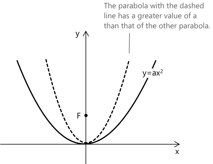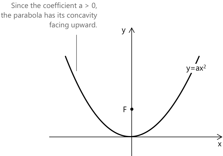 Коли коефіцієнт \( a > 0 \), парабола відкривається вгору. Отже, \( y \geq 0 \) для будь-якого значення \( x \). Фокус також розташований на позитивній півосі y.