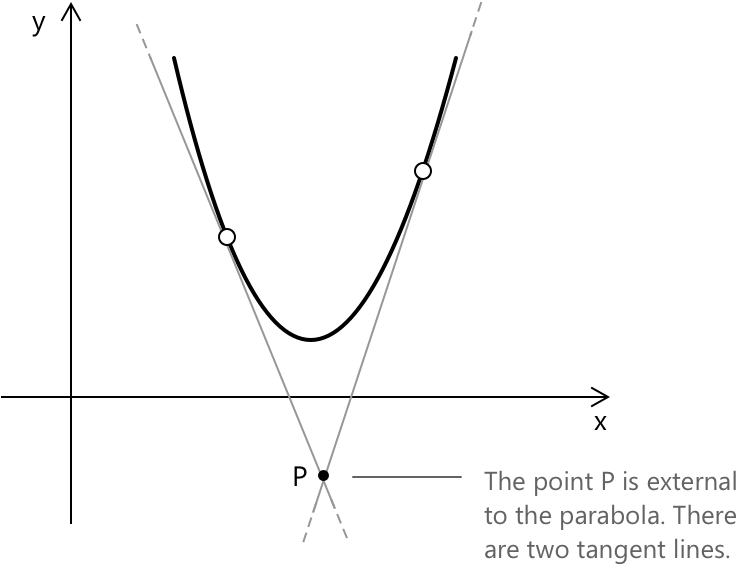 - Обидві прямі є дотичними до параболи: у цьому випадку точка \(P\) лежить зовні параболи.