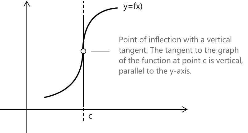 Точка перегину — це точка, в якій змінюється випуклість функції. У цьому випадку ми маємо точку недиференційованості \( c \) функції, що призводить до точки перегину з дотичною, паралельною \( y \)-осі (вертикальною дотичною). У такій точці відбувається наступне: