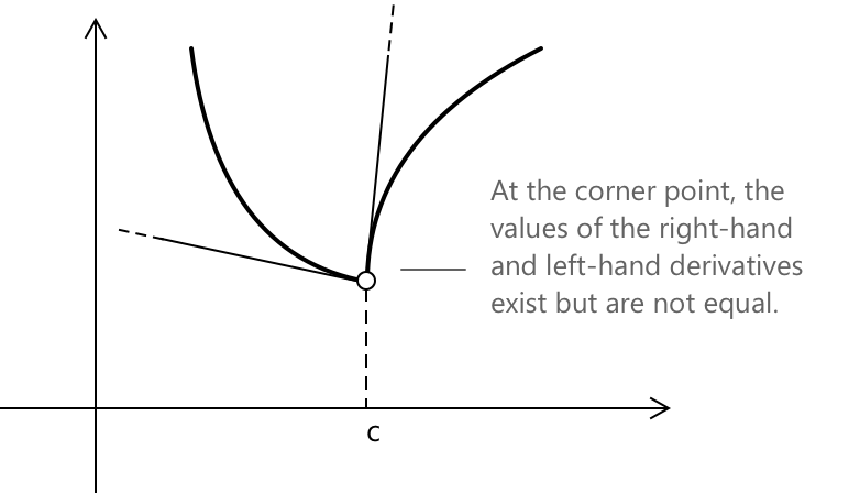 \[f_{-}’ \left (c \right) \neq f_{+}’ \left(c \right) \]