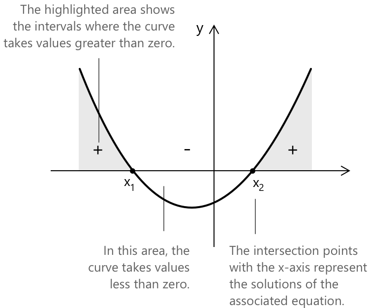 \[ \begin{align} x_1 \leq x \leq x_2 &\quad \text{для} \quad ax^2+bx+c \leq 0 \\[0.5em] x_1 < x < x_2 &\quad \text{для} \quad ax^2+bx+c < 0 \end{align} \]