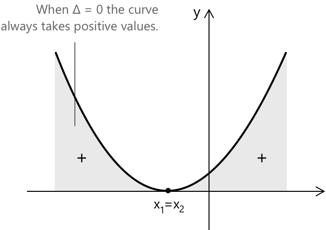 З геометричної точки зору, коли \(\Delta = 0\), крива завжди набуває додатних значень (припускаючи, що коефіцієнт \(a\) більший за нуль). Єдина точка, де крива торкається осі x, знаходиться у подвійному корені, де значення виразу дорівнює нулю \(x_1 = x_2\).