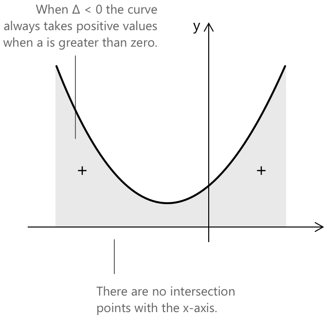 За умови \( \Delta < 0 \), відповідне квадратне рівняння має комплексні корені. Отже, парабола не перетинає вісь x. Виходячи зі знака нерівності та знака старшого коефіцієнта ( a ), ми розрізняємо наступні випадки: