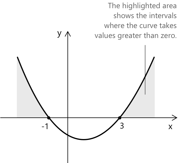 Дійсні корені відповідного рівняння розбивають дійсну пряму на підінтервали, на яких квадратичний поліном зберігає постійний знак. Визначивши знак виразу на кожному з цих інтервалів, ми можемо знайти значення, що задовольняють нерівність.