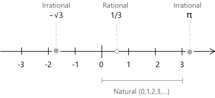 Їхні десяткові розклади є нескінченними та неперіодичними, без будь-якої передбачуваної закономірності. Жодне раціональне число в квадраті не дає 2, 3 або 5. Тим не менш, ці значення займають точні позиції на прямій дійсних чисел, перемішані з раціональними числами, без жодних проміжків.