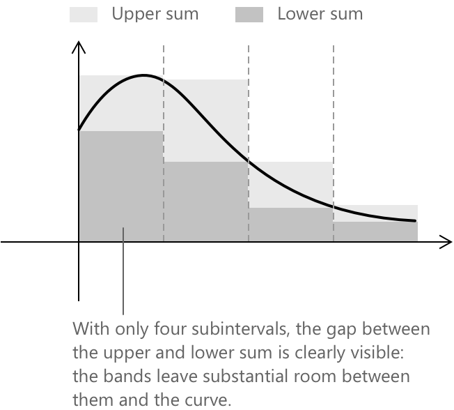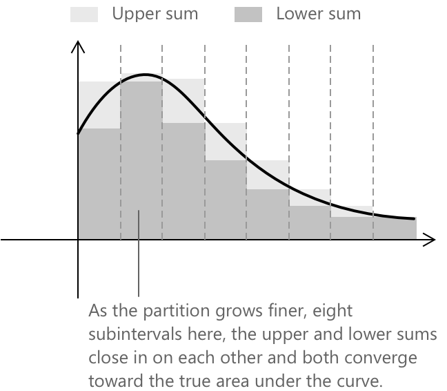 Разом це означає, що в міру того як розбиття стають дрібнішими, верхні та нижні суми стискаються одна до одної. Коли вони зустрічаються в спільній границі, функція є інтегруемою, і ця границя є інтегралом.