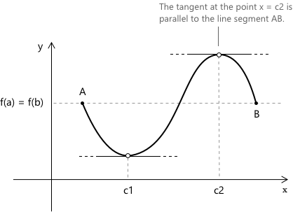 - \(f(x)\) досягає локального максимуму в \(c \in (a, b)\): оскільки \(f\) є диференційовною в \(c\) і \(c\) є внутрішнім екстремумом, за теоремою Ферма похідна задовольняє рівності \(f’ \left(c \right) = 0.\)