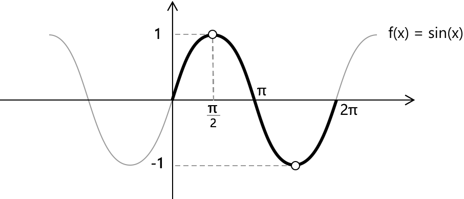 - Точки максимуму та мінімуму: \( \sin(x) \) досягає свого максимуму \(1\) при \( x = \dfrac{\pi}{2} + 2k \pi \) з \( k \in \mathbb{Z} \) та свого мінімуму \(-1\) при \( x = \dfrac{3\pi}{2} + 2k \pi \) з \( k \in \mathbb{Z} \).