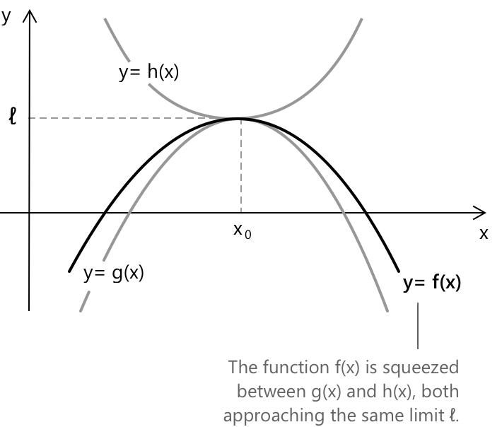 Тепер нехай \( \delta = \min(\delta_1, \delta_2) \). Тоді для кожного \( x \), такого що \( 0 < |x – x_0| < \delta \), обидві наведені вище нерівності виконуються. Але \( f(x) \) затиснута між \( g(x) \) та \( h(x) \), отже:
