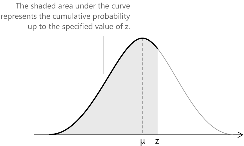 Стандартна Z-таблиця містить для кожної комірки кумулятивну ймовірність ліворуч від заданого значення \(Z\). Іншими словами, вона показує ймовірність того, що стандартна нормальна змінна набуває значення, меншого або рівного заданому Z-показнику. Ці значення відповідають площі під кривою стандартного нормального розподілу від мінус нескінченності до обраної точки на горизонтальній осі, що позначається значенням \( z \).
