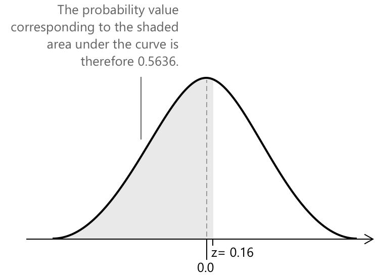 Це означає, що приблизно 56.36% спостережень у стандартному нормальному розподілі лежать нижче цього значення \( z \). Отже, ми можемо стверджувати, що ймовірність того, що стандартизована змінна \( Z \) буде меншою за \( z = 0.16 \), дорівнює \( 0.5636 \), тобто: