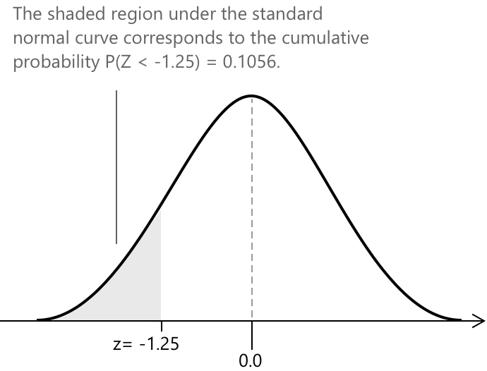 З перетину обраного рядка та стовпця ми отримаємо значення ймовірності, що дорівнює \( 0.1056 \). Рисунок нижче ілюструє, де ця ймовірність розташована під стандартною кривою нормального розподілу, що відповідає кумулятивній площі ліворуч від \( z = -1.25 \).